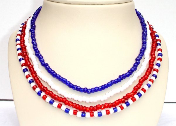 4 Leveled Strands, Red, Blue and White Beads Patriotic Necklace