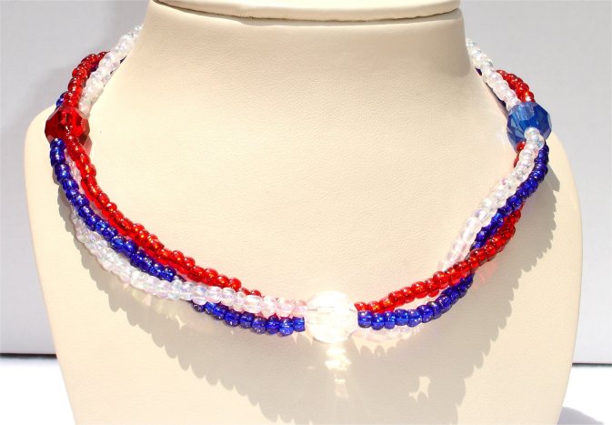3 Strands, Bright Red, Blue and White Beads Patriotic Necklace